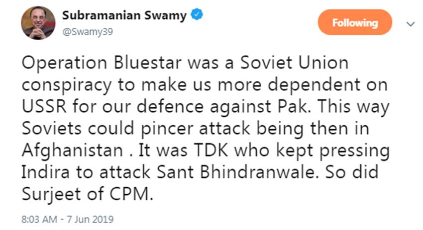 राज्यसभा से बीजेपी सांसद सुब्रमण्यम स्वामी ने पंजाब के दुर्दांत खालसा चरमपंथी जरनैल सिंह भिंडरावाले को संत बताया है। उन्होंने कहा है कि ऑपरेशन ब्लूस्टार सोवियत रूस की साजिश थी। शुक्रवार (सात जून, 2019) को उन्होंने इस बाबत ट्वीट में लिखा, “ऑपरेशन ब्लूस्टार सोवियत संघ की साजिश थी, ताकि हम (भारत) पाकिस्तान से अपने बचाव के लिए यूनियन ऑफ सोवियत सोशलिस्ट्स रिपब्लिक्स (यूएसएसआर) पर निर्भर रहें।”