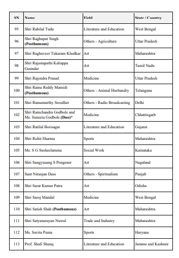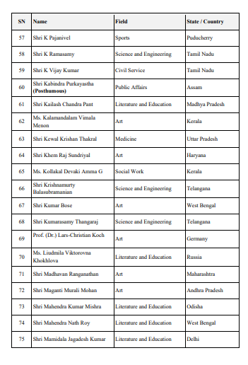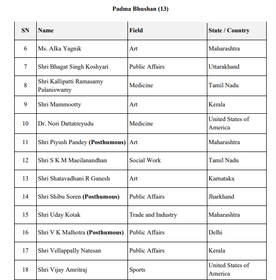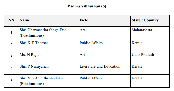 केरल के पूर्व मुख्यमंत्री वी.एस. अच्युतानंदन और बॉलीवुड के दिग्गज अभिनेता धर्मेंद्र सिंह देओल को क्रमशः सार्वजनिक कार्यों और कला के क्षेत्र में मरणोपरांत पद्म विभूषण से सम्मानित किया गया। क्रिकेटर रोहित शर्मा और अभिनेता आर. माधवन पद्म श्री पुरस्कार पाने वालों में शामिल हैं।