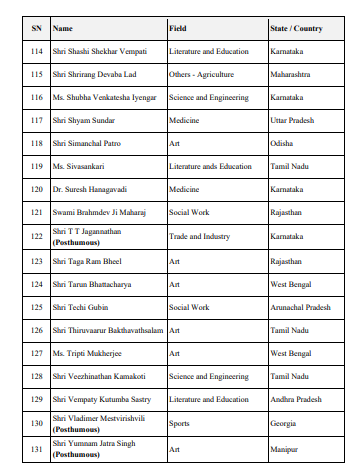 ये पुरस्कार कला और सामाजिक कार्य से लेकर सार्वजनिक मामलों, विज्ञान, इंजीनियरिंग, खेल और सिविल सेवा तक विभिन्न क्षेत्रों में दिए जाते हैं। इस वर्ष राष्ट्रपति ने 131 पद्म पुरस्कारों के प्रदान करने को मंजूरी दी है। जिनमें 5 पद्म विभूषण, 13 पद्म भूषण और 113 पद्म श्री पुरस्कार शामिल हैं।
