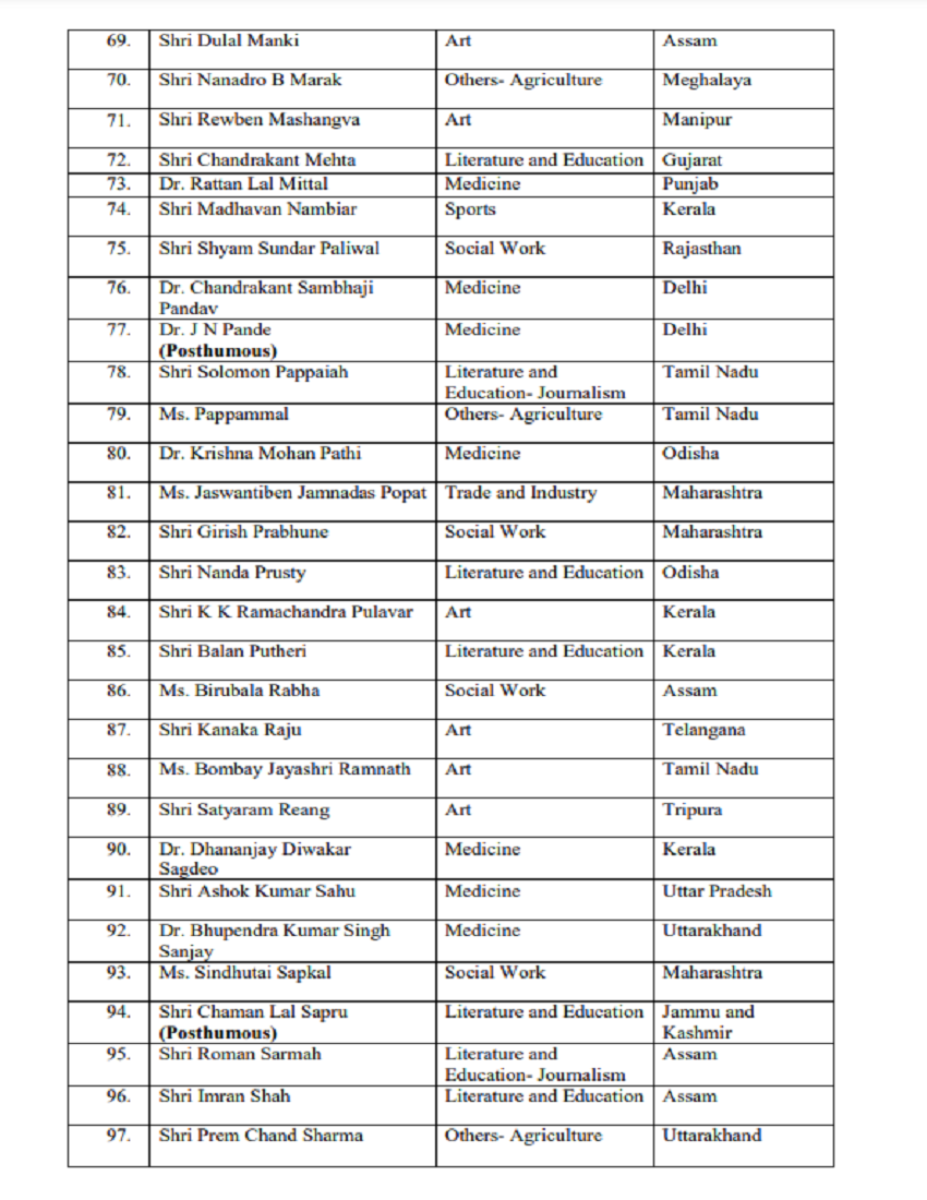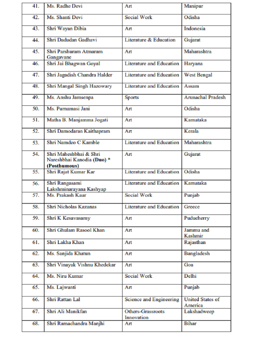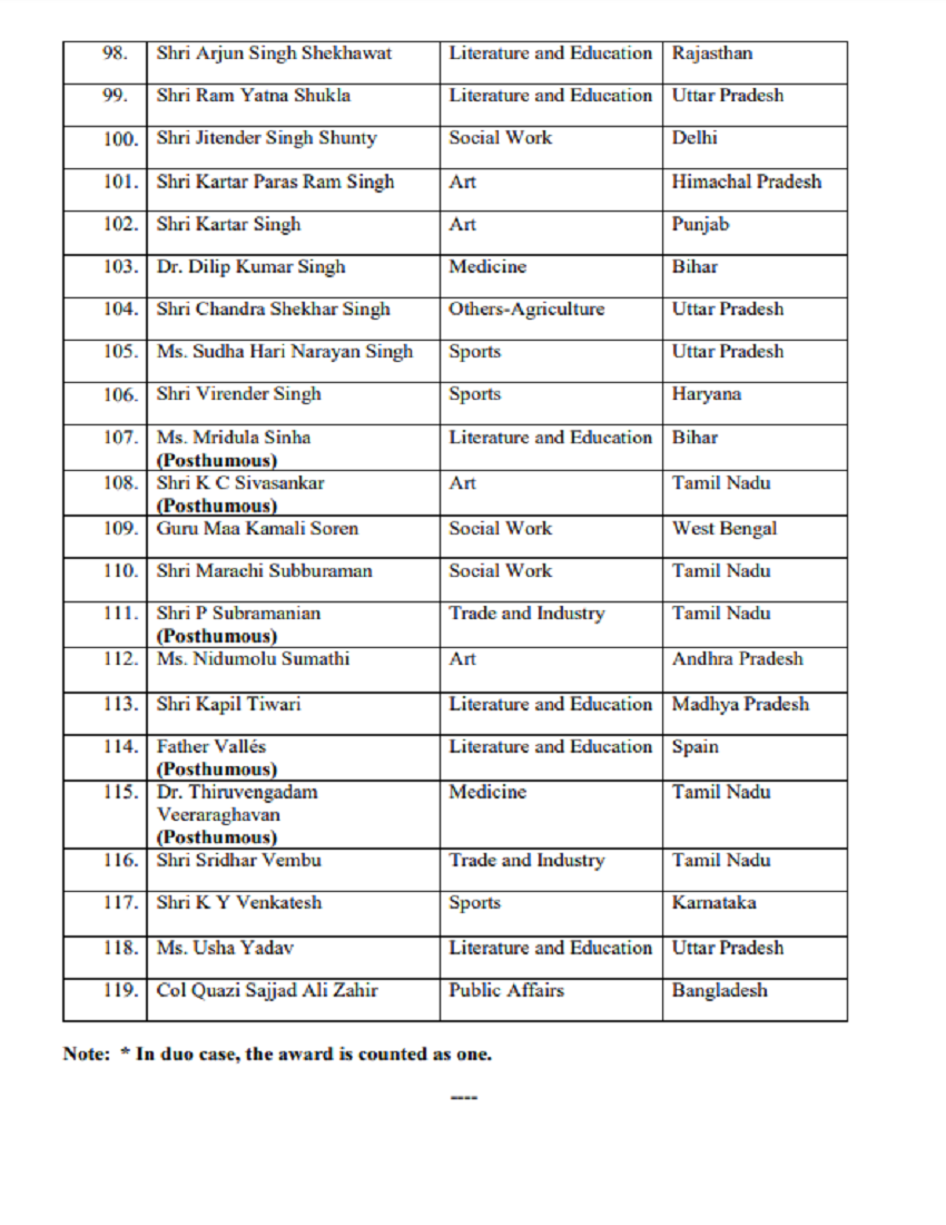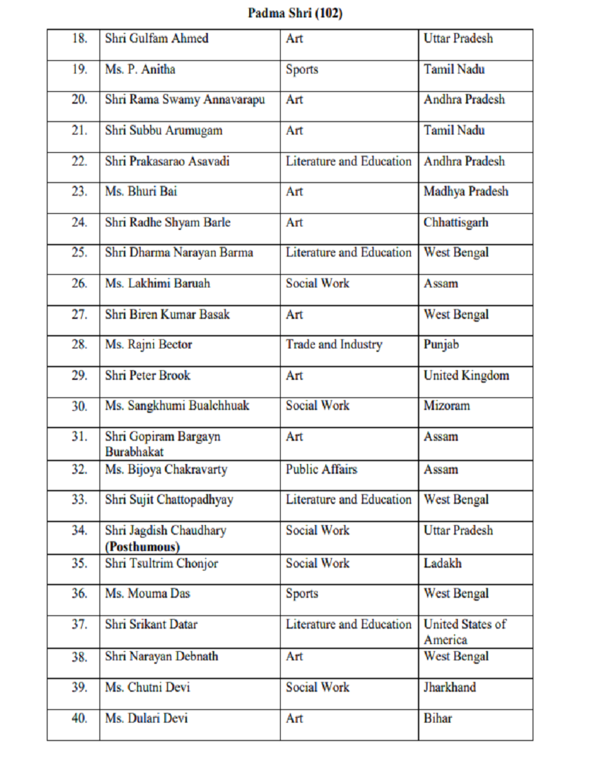उधर, 102 लोगों को पद्म श्री पुरस्कार के लिए चयनित किया गया है, जिनमें गोवा की पूर्व राज्यपाल मृदुला सिन्हा, ब्रिटिश फिल्म निर्देशक पीटर ब्रूक, फादर वालेस (मरणोपरांत), प्रोफेसर चमन लाल सपरू (मरणोपरांत) आदि के नाम हैं।