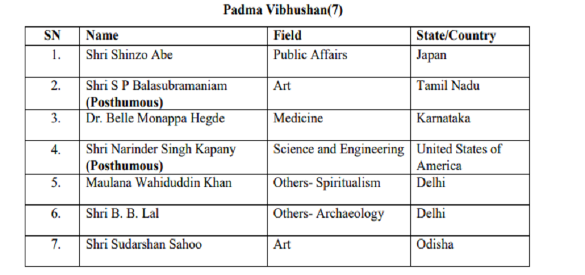 Padma Awards विभिन्न क्षेत्रों में बढ़िया काम के लिए दिए जाते हैं। मसलन- कला, सामाजिक कार्य, पब्लिक अफेयर्स, विज्ञान और इंजीनियरिंग, ट्रेड व इंड्रस्ट्री और मेडिसिन आदि। इस बार जापान के पूर्व प्रधानमंत्री शिंजो आबे, गायक एसपी बालासुब्रमण्यम (मरणोपरांत), सैंड आर्टिस्ट सुदर्शन साहू, आर्कियालॉजिस्ट बीबी लाल को पद्म विभूषण के लिए चुना गया है।