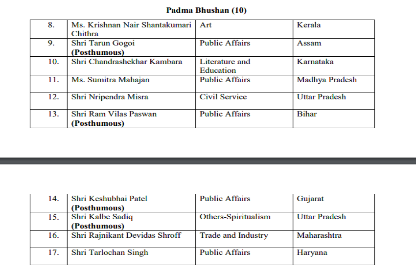 वहीं, पद्म भूषण पुरस्कार के लिए पूर्व लोकसभा स्पीकर सुमित्रा महाजन, प्रधानमंत्री नरेंद्र मोदी के पूर्व प्रधान सचिव नृपेंद्र मिश्रा, पूर्व केंद्रीय मंत्री रामविलास पासवान (मरणोपरांत), असम के पूर्व सीएम तरुण गोगोई (मरणोपरांत) और धार्मिक नेता काल्बे सादिक (मरणोपरांत) उन 10 लोगों में से हैं, जिनें इसके लिए सेलेक्ट किया गया है।