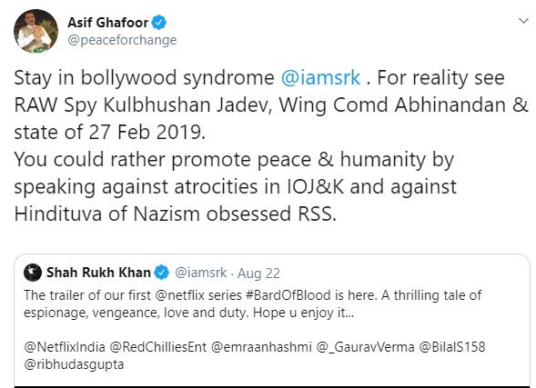 पाकिस्तानी प्रवक्ता ने ट्वीट कर लिखा, ‘शाहरुख खान आप बॉलीवुड सिंड्रोम में घिरे रहिए। हकीकत के लिए रॉ के जासूस कुलभूषण जाधव, विंग कमांडर अभिनंदन और 27 फरवरी, 2019 के हालातों को देखिए।’ ट्वीट में आगे लिखा गया, ‘आप इसके बजाय भारत अधिकृत जम्मू-कश्मीर में हो रहे जुल्म और नाजीवाद के प्रति आसक्त आरएसएस के खिलाफ शांति और मानवता को प्रोत्साहित कर सकते हैं।’