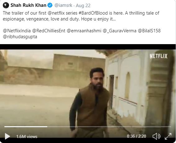 बॉलीवुड सुपरस्टार शाहरुख खान इन दिनों नेटफ्लिक्स पर आने वाली वेब सीरीज ‘बार्ड ऑफ ब्लड’ को लेकर चर्चा में हैं। सीरीज में इमरान हाशमी और विनीत कुमार सिंह मुख्य किरदार में हैं। सीरीज का ट्रेलर भी जारी कर दिया गया है जिसे शाहरुख खान ने अपने ट्विटर अकाउंट पर शेयर किया है। किंग खान बार्ड ऑफ ब्लड को प्रोड्यूस भी कर रहे हैं। हालांकि सीरीज का ट्रेलर लॉंन्च किए जाने के बाद से वह पाकिस्तान सेना के निशाने पर आ गए हैं। दरअसल पाकिस्तान सेना के प्रवक्ता आसिफ गफूर ने सीरीज को लेकर बॉलीवुड एक्टर पर निशाना साधा है। उन्होंने कहा कि शाहरुख खान बॉलीवुड सिंड्रोम से ग्रसित हैं।