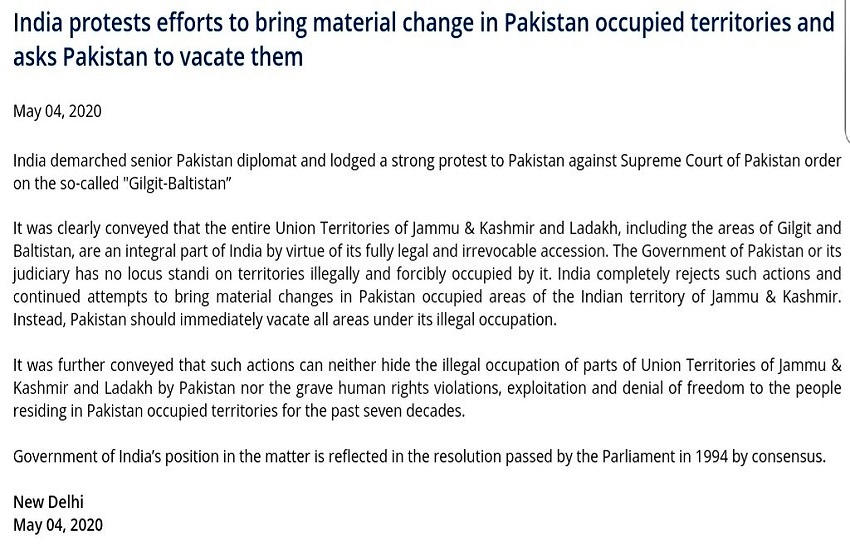 भारत ने पाक से कहा है कि पूरा जम्मू और कश्मीर व लद्दाख भारत का अभिन्न हिसा है, जिसमें गिलगित और बाल्टिस्तान जैसे क्षेत्र भी आते हैं। विदेश मंत्रालय ने आगे चेताते हुए कहा- पाकिस्तान फौरन इन अवैध कब्जे वाले इलाकों को खाली कर दे।
