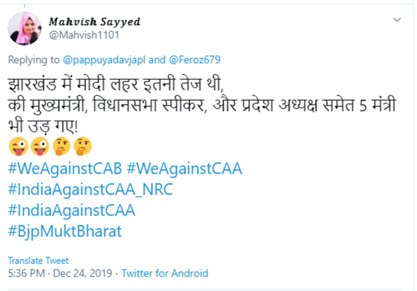 कृष्ण बालदेव पांडे नाम के एक यूजर ने लिखा कि ’70 साल के इतिहास में पहली बार एक निर्दलीय ने मुख्यमंत्री को हरा दिया।’ एक यूजर ने इसपर अपनी प्रतक्रिया देते हुए लिखा कि ‘जनता ने इरफान को जिता कर ढोंगी को कह दिया कि जनता को मंदिर को झुनझुना पसंद नहीं,,,जनता को रोजगार, शिक्षा, अस्पताल…सस्ती बिजली और पानी चाहिए।’ एक यूजर ने लिखा कि ‘झारखंड में मोदी लहर इतनी तेज थी की मुख्यमंत्री, विधानसभा स्पीकर और प्रदेश अध्यक्ष समेत 5 मंत्री भी उड़ गए।’ एक यूजर ने लिखा कि ‘विपक्ष के लिए यह इंसान वरदान हैं…जहां भी जाते हैं विपक्ष की जीत बड़ी हो जाती है।’