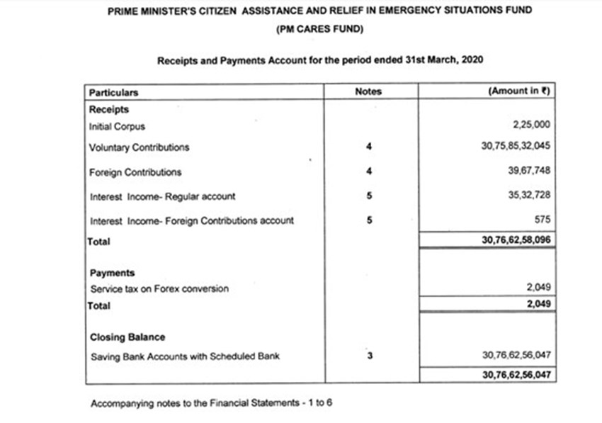 PM CARES Fund का डाटा सरकार ने इसकी आधिकारिक वेबसाइट पर जारी कर दिया है। इस डाटा के मुताबिक पीएम केयर्स फंड के शुरुआती पांच दिन में ही 3000 करोड़ रुपए से ज्यादा का फंड इकट्ठा हो गया था। हालांकि सरकार ने वेबसाइट पर दी गई जानकारी में उसके बाद का डाटा साझा नहीं किया है। सरकारी आंकड़े के अनुसार, वित्तीय वर्ष 2019-20 में पीएम केयर्स फंड के तहत कुल 3076.62 करोड़ रुपए जमा हुए हैं। इसमें से 39.68 लाख रुपए विदेशी मुद्रा में मिले हैं।