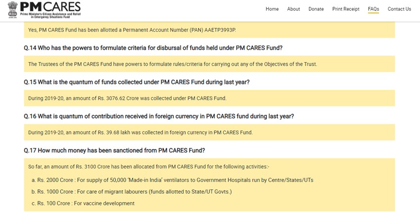 बता दें कि पीएम केयर्स फंड के गठन के बाद से ही इसे लेकर कई सवाल उठ रहे हैं। मुख्य विपक्ष पार्टी कांग्रेस भी इसके गठन पर सवाल उठा चुकी है। बीते दिनों पीएम केयर्स फंड की जानकारी के लिए कई आरटीआई भी दाखिल की गई थीं लेकिन सरकार ने यह कहकर इस बारे में जानकारी देने से इंकार कर दिया था कि यह ‘पब्लिक अथॉरिटी नहीं’ है। आरटीआई दाखिल करने वाले आरटीआई कार्यकर्ता हर्ष कांदुकुरी ने पीएम केयर्स फंड की पारदर्शिता को लेकर चिंता जाहिर की थी।