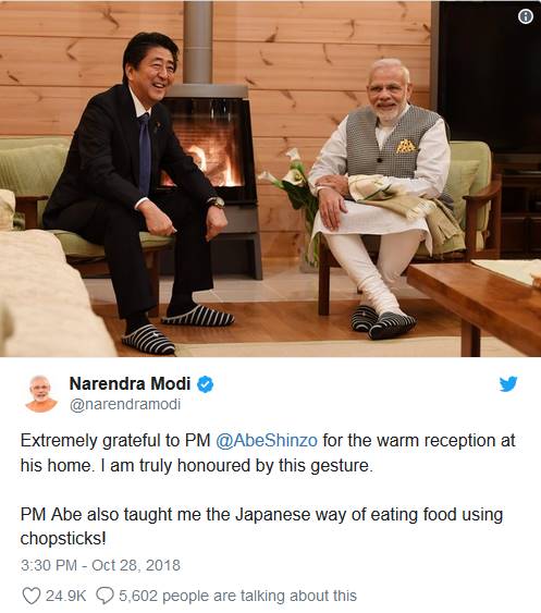 प्रधान मंत्री नरेंद्र मोदी और जापान के प्रधानमंत्री शिंजो आबे पहली बार सितंबर 2014 में मिले थे। इस बार पहली बैठक के बाद यह उनकी 12वीं मुलाकात थी। दोनों नेता पिछले 4 साल से मुलाकात के दौरान लंच और डिनर साथ कर रहे हैं, लेकिन इस बार खाया गया खाना पिछले और बार किए गए खाने से अलग था। हालांकि इस बार खाना अलग नहीं था पर खाने का तरीका अलग था। इस बार जापानी पीएम ने पीएम मोदी को चॉपस्टिक्स से खाना सिखाया। पीएम आबे ने प्रधानमंत्री मोदी को अपने “सबसे भरोसेमंद मित्रों” में से एक बताया और कहा और उन्हें जापान के यामानासी के नारसावा गांव में अपने होलिडे होम में उनकी मेजबानी की। इसके बाद पीएम मोदी ने ट्वीट किया कि, “अपने घर पर स्वागत के लिए शिंजो का आभारी हूं।” इसी ट्वीट में पीम मोदी ने बताया कि शिंजो आबे ने चॉप्सटिक्स से खाना खाना सिखाया।
