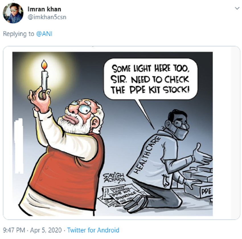 वहीं, @imkhan5csn ने एक कार्टून शेयर किया, जिसमें पीएम मोदी मोमबत्ती लिए थे। उनके पास स्वास्थ्य विभाग की ओर से एक मुंह पर पट्टी बंधा शख्स मन ही मन कहता नजर आ रहा था कि कुछ लाइट यहां भी दिखा दीजिए। पीपीई स्टॉक को भी चेक करने की जरूरत है।