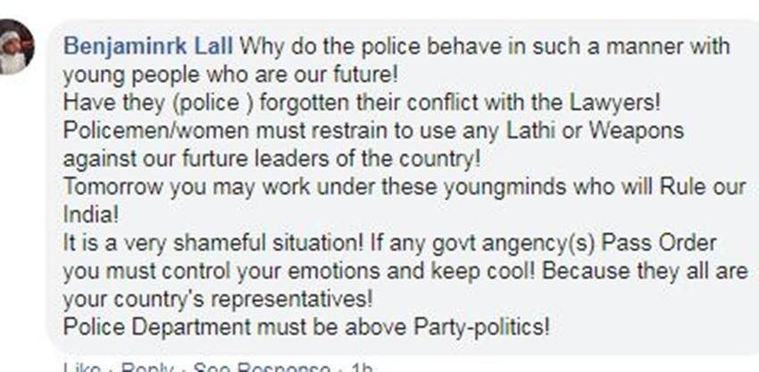 एक यूजर ने कहा, “देश के भविष्य इन युवा लोगों के साथ पुलिस ऐसा व्यवहार क्यों कर रही है? क्या पुलिस वकीलों के साथ हुए संघर्ष को भूल गई है! पुलिसकर्मियों को हमारे भविष्य के नेताओं के खिलाफ लाठी या हथियार के इस्तेमाल से परहेज करना चाहिए। यह बेहद ही शर्मनाक पल है। पुलिस को पार्टी लाइन से अलग हटकर काम करना चाहिए।”