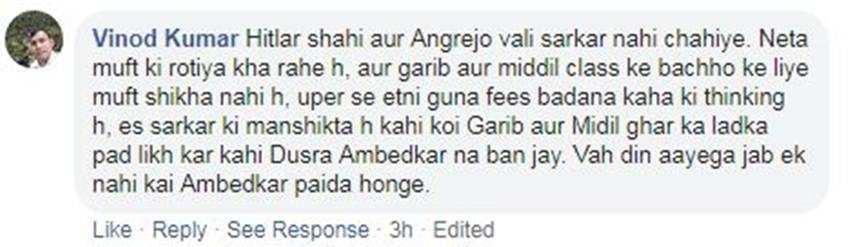 एक दूसरे यूजर ने लिखा, “हिटलरशाही और अंग्रेजों वाली सरकार नहीं चाहिए। नेता मुफ्त की रोटियां खा रहे हैं और गरीब तथा मिडिल क्लास के बच्चों के लिए मुफ्त शिक्षा नहीं है। ऊपर से इतनी गुना फीस बढ़ाना कहा कि सोच है। ये सरकार मानसिकता है कि कोई गरीब या मिडल क्लास का लड़का पढ़-लिखकर दूसरा अंबेडकर न बन जाए। वह दिन आएगा जब एक नहीं, कई अंबेडकर पैदा होंगे।