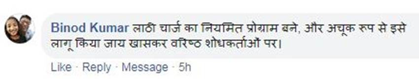 काफी संख्या में लोगों ने पुलिस द्वारा किए गए लाठी चार्ज को सही करार दिया। इन लोगों का कहना है कि बाकी यूनिवर्सिटी की तरह जेएनयू में भी फीस होनी चाहिए। एक यूजर ने तंज कसते हुए कहा, “लाठी चार्ज का नियमित प्रोग्राम बने और अचूक रूप से इसे लागू किया जाए। खासकर वरिष्ठ शोधकर्ताओं पर।
