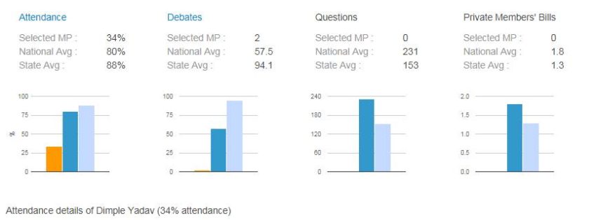 डिंपल यादवः कन्नौज से 40 वर्षीय सपा सांसद और अखिलेश यादव की पत्नी डिंपल यादव की संसद में महज 34 प्रतिशत उपस्थिति रही। चार सालों के बीच डिंपल ने महज दो डिबेट में हिस्सा लिया। संसद में 231 सवालों के औसत के मुकाबले डिंपल ने एक भी जनहित के मुद्दे पर सवाल नहीं पूछे। बतौर संसद सदस्य उन्होंने कोई प्राइवेट बिल भी पेश नहीं किया। 16 वीं लोकसभा में डिंपल सबसे ज्यादा पहले सत्र में ही उपस्थिति रहीं, तब उनकी उपस्थिति 81 फीसद रही, इसके बाद से सदन में उनकी मौजूदगी कम होती गई। 2014 के बजट सेश न में 37 प्रतिशत, 2015 मे 34 और 2016 में 38, 2017 में सिर्फ 14 प्रतिशत मौजूद रहीं। 2018 के बजट सत्र में 43 प्रतिशत मौजूदगी रही। डिंपल यादव ने 28 अप्रैल 2016 को आम बजट डिमांड फार ग्रांट्स और सात अगस्त को महिलाओं तथा बच्चों के खिलाफ अपराध रोकने के लिए कड़े कानून बनाने पर बहस की।