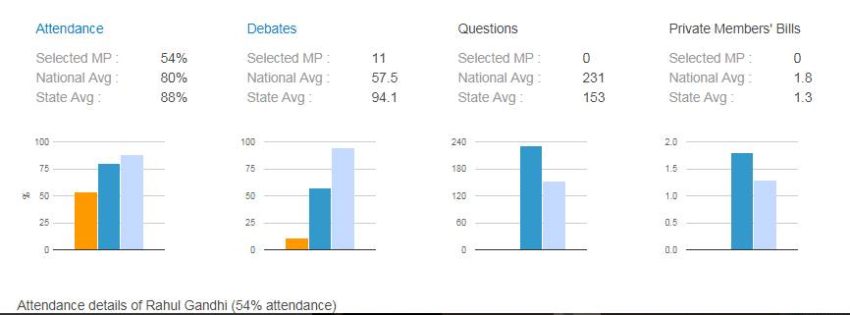 राहुल गांधीः 47 वर्षीय कांग्रेस अध्यक्ष राहुल गांधी की संसद में 54 प्रतिशत उपस्थिति रही। राष्ट्रीय औसत 80 से 26 प्रतिशत कम मौजूदगी रही। राहुल सिर्फ 11 बहसों में ही हिस्सा लिए। डिबेट में सांसदों की सहभागिता का औसत 57.5 रहा। अब तक चार साल में उन्होंने एक भी सवाल नहीं पूछे हैं। जबकि देश के हर सांसद पर औसतन 231 सवाल का आंकड़ा बैठता है। यही नहीं राहुल ने एक भी गैर सरकारी विधेयक पेश नहीं किया। । तीसरी बार सांसद राहुल एक्सटर्नल अफेयर्स स्टैंडिंग कमेटी के मेंबर है। एक जून 2014 से नौ फरवरी को समाप्त हुए बजट सत्र के बीच राहुल गांधी ने बजट सत्र 2018 में 86 प्रतिशत, मानसून सत्र 2017 में 45 प्रतिशत, विंटर सेशन 2016 में 57 प्रतिशत उपस्थिति दी है। बजट सेशन 2015 में 31 प्रतिशत मौजूद रहे वहीं 2014 के बजट सेशन में 81 प्रतिशत और पहले सेशन में 67 प्रतिशत मौजूदगी रही।