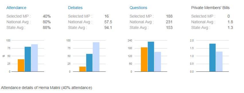हेमा मालिनीः मथुरा से 69 वर्षीय बीजेपी सांसद हेमा मालिनी की संसद में महज 40 प्रतिशत मौजूदगी रही। उन्होंने 16 बहसों में हिस्सा लिया, वहीं 188 सवाल पूछे। यहां बता दें कि उपस्थिति का औसत 80 प्रतिसत, डिबेट्स का 57.5 सवाल का 231 रहा। उपस्थिति की बात करें तो बजट सेशन 2014 में महज सात प्रतिशत अटेंडेंस रही, वहीं मानसून सत्र 2016 में सिर्फ दस प्रतिशत। बजट सेशन 2018 में सबसे ज्यादा 71 प्रतिशत उपस्थिति रही। हालांकि सवाल पूछने मे जरूर हेमामालिनी का प्रदर्शन कुछ अच्छा रहा है। उन्हें हेल्थ सर्विस, जल क्रांति अभियान, जल की उपलब्धता, शौचालयों के निर्माण आदि पर 188 सवाल पूछे।