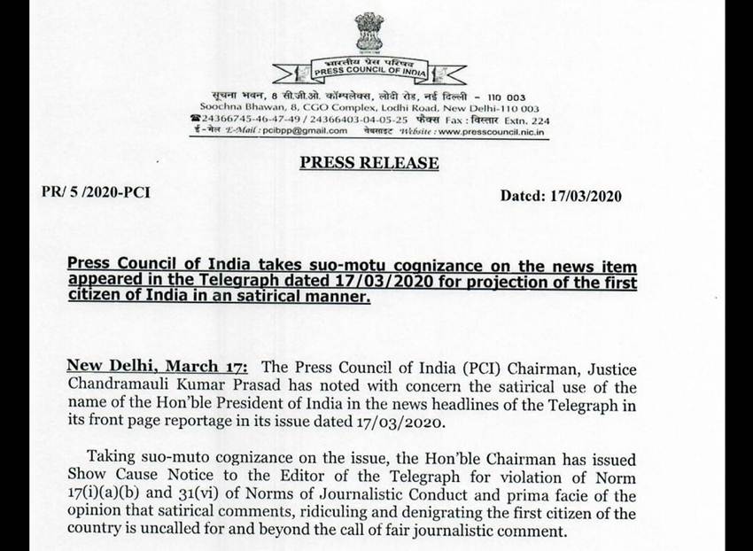 नोटिस में लिखा है कि पीसीआई के अध्यक्ष न्यायमूर्ति चंद्रमौली कुमार प्रसाद ने इस मुद्दे पर ‘भारत के माननीय राष्ट्रपति के नाम के व्यंग्यपूर्ण प्रयोग’ को लेकर चिंता व्यक्त की। दरअसल अखबार ने 17 मार्च के अपने अखबार के एडिशन में जस्टिस रंजन गोगोई को राज्यसभा के लिए नामित किए जाने की खबर के साथ भारत के राष्ट्रपति का नाम भी प्रकाशित किया था। नोटिस में आगे कहा गया है, “प्रथम विचार यह है कि देश के पहले नागरिक पर व्यंग्यपूर्ण टिप्पणी, उपहास और बदनाम करना निष्पक्ष पत्रकारिता से परे है।”