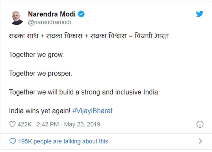 उस वक्त प्रधानमंत्री नरेंद्र मोदी द्वारा किये गये एक ट्वीट ‘सबका साथ + सबका विकास + सबका विश्वास = विजयी भारत. Together we grow. Together we prosper. Together we will build a strong and inclusive India. India wins yet again! #VijayiBharat.’ को ट्विटर ने इस साल का गोल्डन ट्वीट चुना है। हैशटैग (#) की बात करें तो #loksabhaelections2019 ट्विटर पर सबसे ज्यादा चलन में रहा।