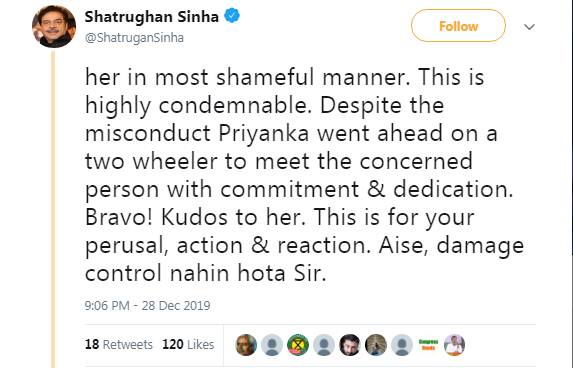सिन्हा ने आगे लिखा कि “यह बहुत निंदनीय है। बदसलूकी के चलते प्रियंका गांधी टू व्हीलर से सफर कर पीड़ित परिजनों से मिलने पहुंची। उनके समर्पण को सलाम है। यह आपके एक्शन का रिएक्शन है। ऐसे डैमेज कंट्रोल नहीं होता सर।”