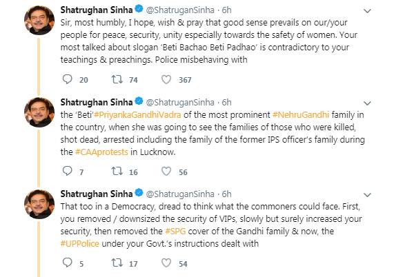 कांग्रेस महासचिव प्रियंका गांधी वाड्रा ने हाल ही में यूपी पुलिस पर उनके साथ अभद्रता करने का आरोप लगाया था। इस मामले को लेकर आरोप प्रत्यारोप का दौर जारी है। इसी बीच कांग्रेस नेता शत्रुघ्न सिन्हा ने कई ट्वीट कर प्रियंका गांधी से पुलिस द्वारा कथित तौर पर अभद्रता करने के मामले में पीएम मोदी पर तीखा हमला बोला।