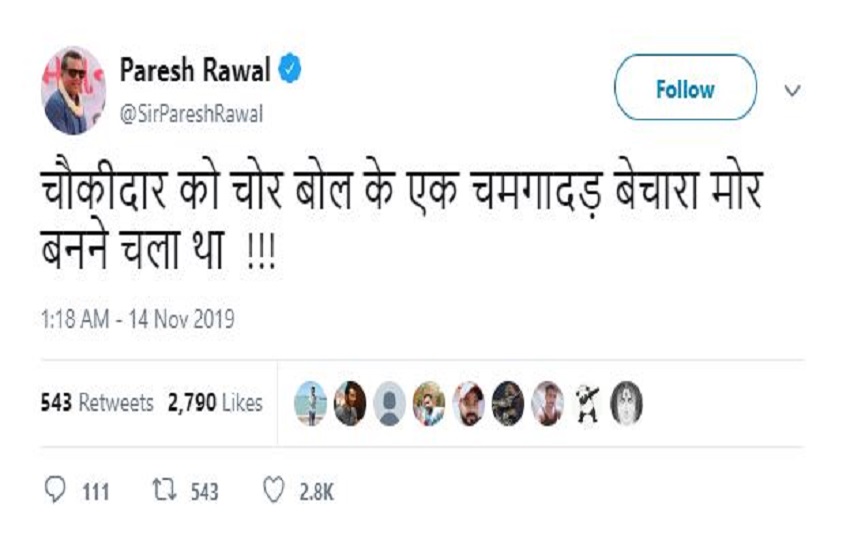 परेश रावल ने कसा तंज: गुरूवार को सुप्रीम कोर्ट का निर्णय आने के बाद बीजेपी के पूर्व सांसद परेश रावल ने कांग्रेस नेता राहुल गांधी पर बिना नाम निशाना साधा। उन्होंने ट्वीट में लिखा- “चौकीदार को चोर बोल के एक चमगादड़ बेचारा मोर बनने चला था।”