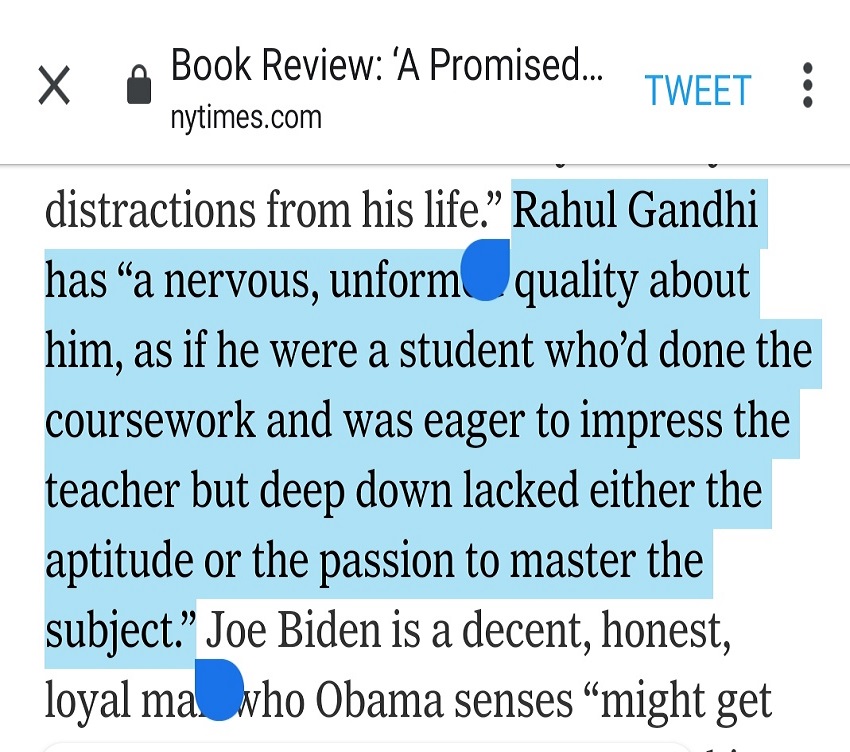 @rahulroushan ने किताब में राहुल पर की गई ओबामा की उसी टिप्पणी का स्क्रीनशॉट शेयर किया। साथ ही लिखा- ओबामा ने राहुल के बारे में ये लिखा है। हमारे राजकुमार को कम आंकने की उन अमेरिकी की हिमाकत कैसे हुई?