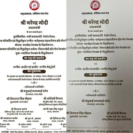 बीजेपी के विरोध के आगे रेलवे ने कमलापति स्टेशन के लोकार्पण समारोह का कार्ड ही तब्दील कर दिया। प्रोग्राम से चंद घंटों पहले दिग्विजय सिंह, एमजे अकबर समेत कई नेताओं के नाम हटा दिए गए। कार्ड में सिर्फ प्रधानमंत्री मोदी, राज्यपाल मंगुभाई छगनभाई पटेल, मुख्यमंत्री शिवराज सिंह चौहान और केन्द्रीय रेलवे मंत्री अश्विनी वैष्णव के नाम ही रखे गए।