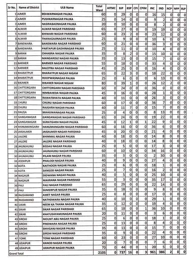 Rajasthan Local Body Election Results 2019, Rajasthan Nagar Nikaya, Palika, Nigam, Parishad, Gram Panchayat Election/Chunav Result 2019 Highlights: राजस्थान के निकाय चुनाव में सत्तारूढ़ कांग्रेस ने शानदार प्रदर्शन किया है। 49 निकायों के 965 वार्डों में जीत के बाद पार्टी नेताओं ने 30 में कांग्रेस का बोर्ड बनने की उम्मीद जताई है। उसके पास 20 निकायों में ही स्पष्ट बहुमत है जबकि बाकी में उसे निर्णायक निर्दलीय पार्षदों का समर्थन मिलने की उम्मीद है।