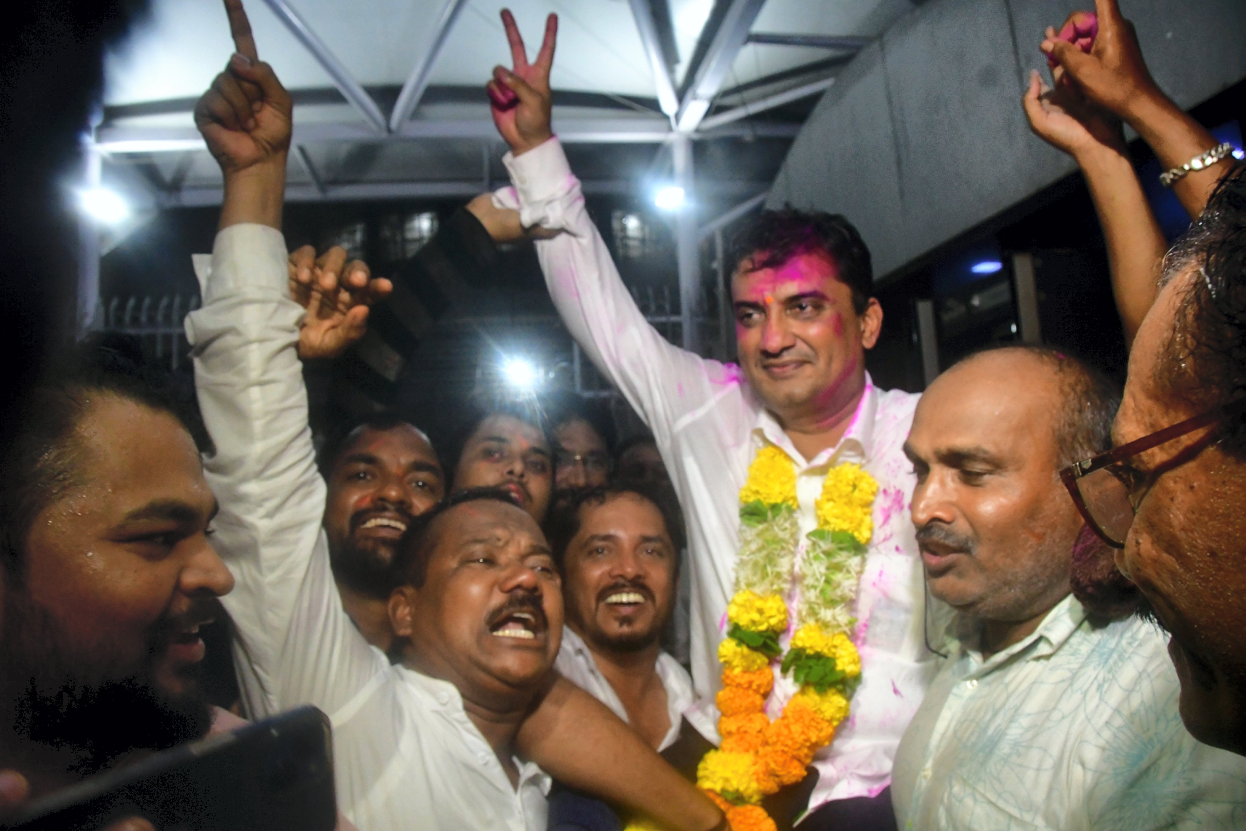 मुंबई में जीत के बाद बीजेपी के विजयी उम्मीदवार धनंजय भीमराव महादिक इस अंदाज में नजर आए। (फोटोः पीटीआई)