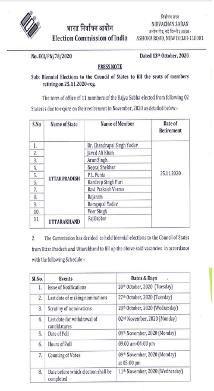 अभिनेता-नेता राज बब्बर का भी उत्तराखंड से राज्यसभा सदस्य के तौर पर कार्यकाल 25 नवंबर को समाप्त होगा। मतगणना तय प्रक्रिया के अनुसार, मतदान के बाद नौ नवंबर की शाम को की जाएगी। निर्वाचन आयोग ने बताया कि चुनाव के लिए अधिसूचना 20 अक्टूबर को जारी की जाएगी।