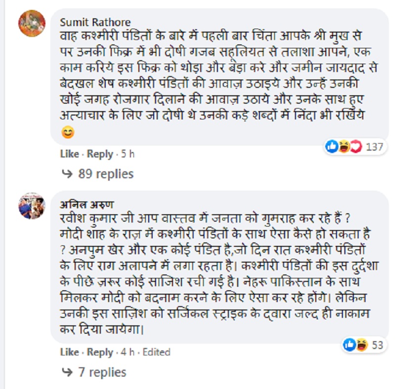 कश्मीर में कश्मीरी पंडितों के पुनर्वास के लेकर किए गए वादे को पूरा नहीं करने से कश्मीरी पंडित नाराज हैं। मोदी सरकार ने अपने पहले कार्यकाल में इन पंडितों के लिए आर्थिक मदद और नौकरियों में आरक्षण का आदेश भी दिया था, लेकिन दो साल से ज्यादा का समय गुजरने के बाद भी अभी तक ज़मीन पर कुछ नहीं हुआ। इसी मामले क लेकर पत्रकार रवीश कुमार ने फेसबुक पर एक पोस्ट शेयर की जिसके बाद सोशल मीडिया यूजर्स उनपर भड़क उठे।