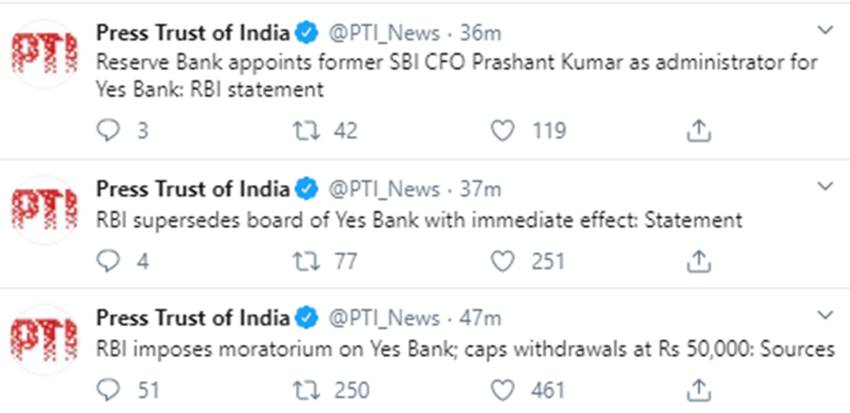 आरबीआई ने देर शाम जारी बयान में कहा कि येस बैंक के निदेशक मंडल को तत्काल प्रभाव से भंग कर दिया गया है और भारतीय स्टेट बैंक (एसबीआई) के पूर्व मुख्य वित्त अधिकारी (सीएफओ) प्रशांत कुमार को येस बैंक का प्रशासक नियुक्त किया गया है।