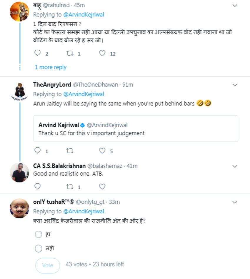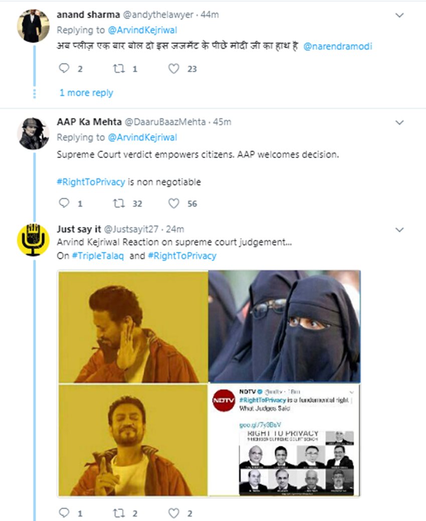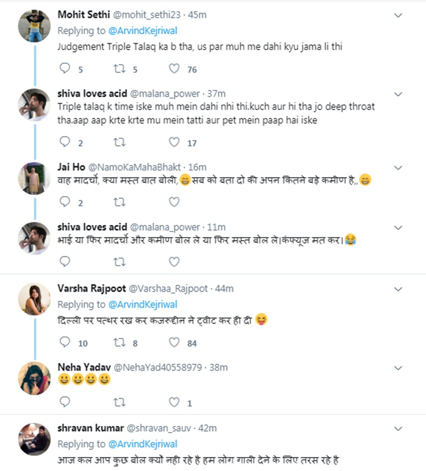 बस इस पर ही ट्विटर यूजर्स उन पर बरस पड़े। ट्विटर यूजर्स ने एक बार में तीन तलाक देने पर सुप्रीम कोर्ट द्वारा 6 महीने के लिए लगाए गए बैन पर चुप्पी साधने को लेकर केजरीवाल को लताड़ा। हालांकि तीन तलाक बैन का पार्टी द्वारा स्वागत किए जाने वाले आशुतोष के ट्वीट को केजरीवाल ने रीट्वीट किया था, लेकिन यूजर्स ने उनके(केजरीवाल) कुछ नहीं लिखने पर सवाल खड़े किए। लोगों ने कहा कि उन्हें तीन तलाक पर सुप्रीम कोर्ट के फैसले का स्वागत जोर-शोर से करना चाहिए था। वहीं कुछ ट्विटर यूजर्स ने उन्हें ट्रोल किया। एक ने लिखा, “Judgement Triple Talaq ka b tha, us par muh me dahi kyu jama li thi” एक अन्य ट्विटर यूजर वर्षा राजपूत ने लिखा, “दिल्ली पर पत्थर रख कर कजरूद्दीन ने ट्वीट कर ही दी” ऐसे ही कई लोगों ने केजरीवाल को ट्रोल किया।