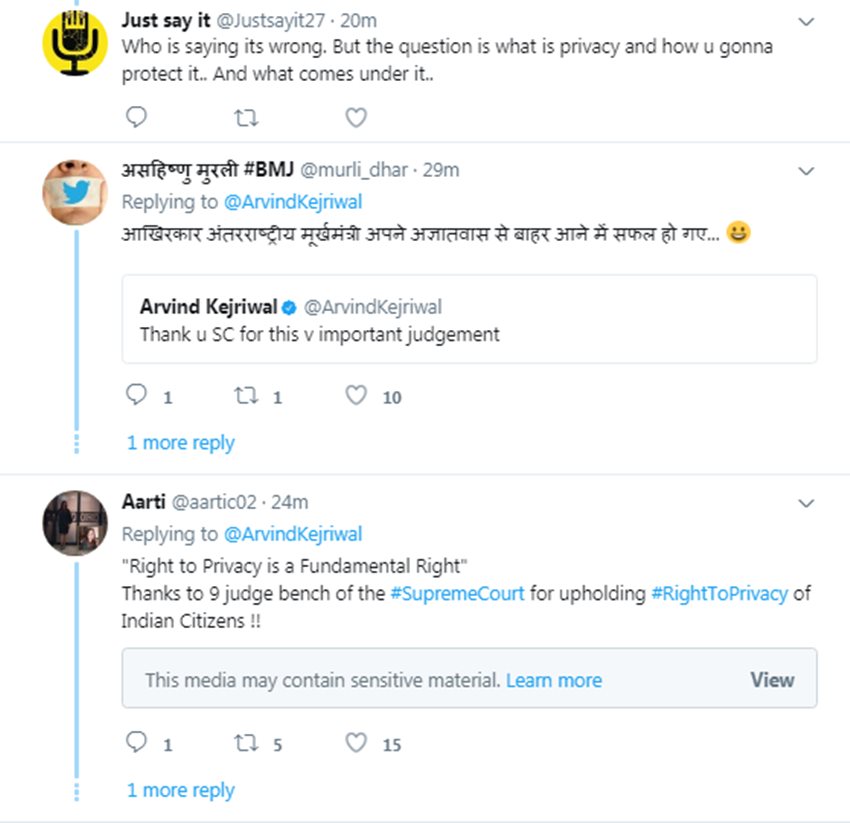 सर्वोच्च न्यायालय ने गुरुवार (24 अगस्त) को निजता के अधिकार पर बड़ा फैसला दिया है। सुप्रीम कोर्ट ने निजता के अधिकार को मौलिक अधिकार करार दिया है। 9 जजों की बेंच से सर्वसम्मति से ये फैसला दिया है। इस फैसले के बाद देश के किसी भी नागरिक की निजी जानकारी सार्वजनिक नहीं की जा सकेगी। यह फैसला लोकतंत्र के लिए बड़ी जीत माना जा रहा है। सुप्रीम कोर्ट के इस फैसले की कई लोगों ने तारीफ की है। इसी बीच अरिंवद केजरीवाल को ट्रोल्स का सामना करना पड़ गया है। केजरीवाल ने भी ट्विटर पर इस फैसले की तारीफ की थी। उन्होंने लिखा था, “Thank u SC for this v important judgement” इस फैसले के लिए उन्होंने सुप्रीम कोर्ट को धन्यवाद दिया।