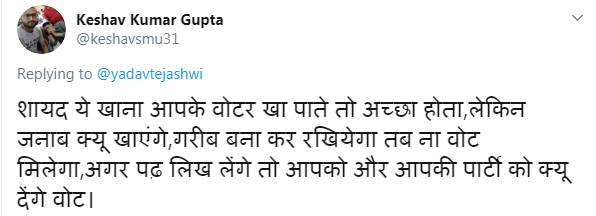 बता दें कि तेजस्वी यादव ने ट्वीट कर लिखा कि “दूध वाला प्लेन में चढ़ चाय कैसे पी रहा, यह एक और इल्जाम हम पर आ रहा। कुछ लोगों को परेशान देख हम परेशान हो जाते हैं। अफसोस! फिर भी उन लोगों के मुर्शिद उनसे खुश नहीं हो पाते हैं। हम सड़क पर अमरूद, भुट्टा, भूंजा और चाट भी खाते हैं और प्लेन में कबाब भी। लेकिन पेट दर्द किसी और को होता है।”