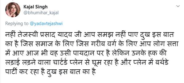 हाल ही में राजद नेता तेजस्वी यादव ने अपना 30वां जन्मदिन मनाया। इस दौरान उन्होंने एक चार्टेड प्लेन में जन्मदिन का केक काटा था। जिसकी तस्वीरें सोशल मीडिया पर भी खूब देखी गई थी। इस दौरान जदयू नेताओं ने तेजस्वी यादव को यह कहकर निशाने पर लिया था कि पिता लालू प्रसाद यादव जेल में हैं और तेजस्वी चार्टेड प्लेन में अपना जन्मदिन मना रहे हैं। अब तेजस्वी यादव ने ट्वीट कर अपने आलोचकों को जवाब दिया है और अपने बर्थडे सेलिब्रेशन को जायज ठहराया है। हालांकि इस ट्वीट को लेकर भी लोगों ने तेजस्वी यादव को ट्रोल कर दिया है।