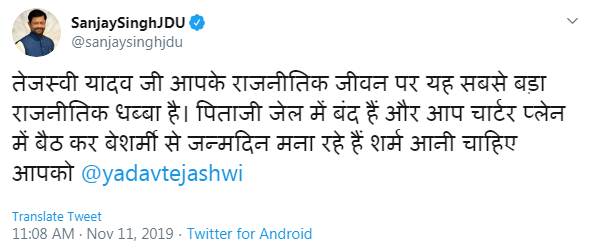 एक अन्य ट्वीट में संजय सिंह ने लिखा कि ‘तेजस्वी यादव जी आपके राजनीतिक जीवन पर यह सबसे बड़ा राजनीतिक धब्बा है। पिताजी जेल में बंद हैं और आप चार्टर प्लेन में बैठकर बेशर्मी से जन्मदिन मना रहे हैं, शर्म आनी चाहिए आपको।’ उल्लेखनीय है कि तेजस्वी यादव ने बीती 9 नवंबर को रांची से पटना जाते हुए चार्टेड प्लेन में अपना जन्मदिन मनाया। झारखंड विधानसभा चुनाव के चलते सीट बंटवारे के लिए तेजस्वी यादव रांची में अपने पिता लालू यादव से मिलने पहुंचे थे, जो कि चारा घोटाले के मामले में रांची जेल में सजा काट रहे हैं।