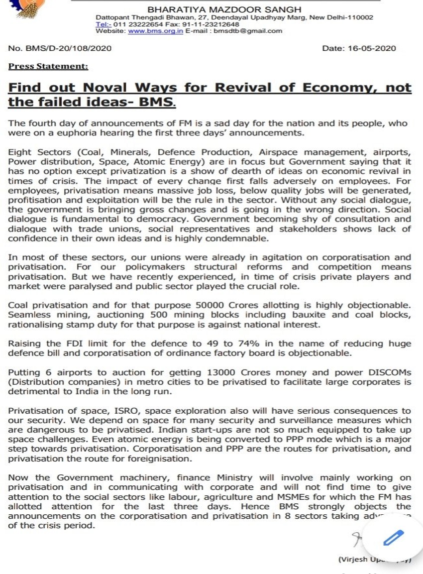 इसी बीच, राष्ट्रीय स्वयंसेवक संघ (RSS) से जुड़े संगठन भारतीय मजदूर संघ (BMS) ने केंद्र के कदमों का कड़ा विरोध किया। बयान जारी कर कहा, “वित्त मंत्री की घोषणाओं का चौथा दिन, देश और देश के उन लोगों के लिए दुखद है, जो पहले तीन दिन के ऐलानों के बाद सातवें आसमान पर थे। आठ सेक्टर्स (कोयला, मिनरल्स, डिफेंस प्रोडक्शन, एयरस्पेस मैनेजमेंट, एयरपोर्ट्स, पावर डिस्ट्रीब्यूशन, स्पेस और अटॉमिक एनर्जी) पर जोर दिया गया है, पर सरकार कह रही है कि उसके पास संकट की इस घड़ी में निजीकरण के अलावा और कोई विकल्प नहीं है।”