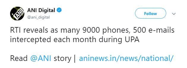 जासूसी के मुद्दे पर केंद्र की नरेंद्र मोदी सरकार पर हमला बोल रही कांग्रेस के लिए यह खबर परेशान करने वाली है। सूचना का अधिकार (RTI) के तहत मिली जानकारी के मुताबिक यूपीए शासन काल में हर महीने औसतन 7500 से 9000 फोन और 300 से 600 ई-मेल आईडी इंटरसेप्ट होते थे। समाचार एजेंसी एएनआई ने एक आरटीआई के जवाब की कॉपी ट्वीट की है, जो गृह मंत्रालय से जारी की गई है। यह पत्र नई दिल्ली के प्रसेनजीत मंडल को 06 अगस्त 2013 को भेजी गई है। पत्र में लिखा है कि औसतन 7500 से 9000 फोन केंद्र सरकार के आदेश पर हरेक महीने इंटरसेप्ट होता था। मंत्रालय ने इससे आगे की जानकारी देने से इनकार किया था। यह पत्र राजेश कुमार गुप्ता, निदेशक (आंतरिक सुरक्षा) की तरफ से जारी किया गया था।