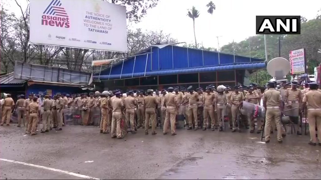सुप्रीम कोर्ट के आदेश के बाद अभी तक केरल के सबरीमाला मंदिर में 10 से 50 साल की महिलाओं को एंट्री नहीं मिल सकी है। एंट्री को लेकर विवाद न बढ़ने पाए और हालात काबू में रहें, इसलिए निलक्कल के पास भारी पुलिस बल तैनात किया गया है। (फोटोः एएनआई)
