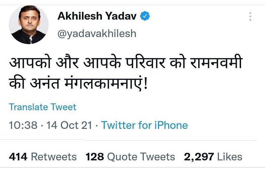 अखिलेश यादव ने महानवमी की मंगलकामना देने को लेकर दो ट्वीट किए। पहले ट्वीट में उन्होंने लिखा कि, “आपको और आपके परिवार को रामनवमी की अनंत मंगलकामनाएं।” इसपर जब लोगों ने उन्हें ट्रोल किया तो उन्होंने उस ट्वीट को डिलीट कर दिया।