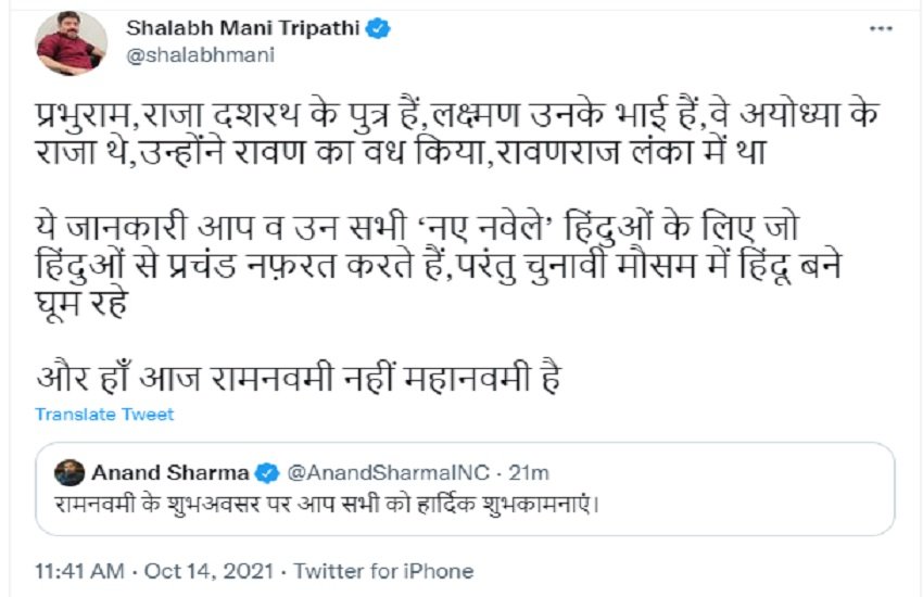शलभमणि त्रिपाठी ने दिया जवाब: इसपर योगी सरकार के सूचना सलाहकार शलभमणि त्रिपाठी ने लिखा कि, “प्रभुराम,राजा दशरथ के पुत्र हैं,लक्ष्मण उनके भाई हैं,वे अयोध्या के राजा थे,उन्होंने रावण का वध किया,रावणराज लंका में था ये जानकारी आप व उन सभी ‘नए नवेले’ हिंदुओं के लिए जो हिंदुओं से प्रचंड नफ़रत करते हैं, परंतु चुनावी मौसम में हिंदू बने घूम रहे..और हाँ आज रामनवमी नहीं महानवमी है।”