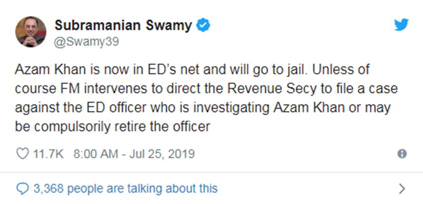 इसी बीच, बीजेपी सांसद सुब्रमण्यम स्वामी ने ट्वीट कर कहा है, “आजम अब प्रवर्तन निदेशालय (ईडी) के जाल में हैं और वह जेल जाएंगे। जब तक वित्त मंत्री रेवन्यू सेक्रेट्री को उस ईडी अधिकारी की जांच के आदेश नहीं देतीं, जो कि आजम की जांच कर रहा है या फिर उस अधिकारी को जानबूझ कर रिटायर किया जाए।”