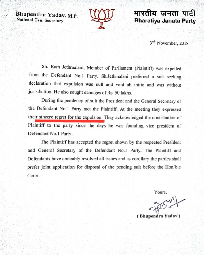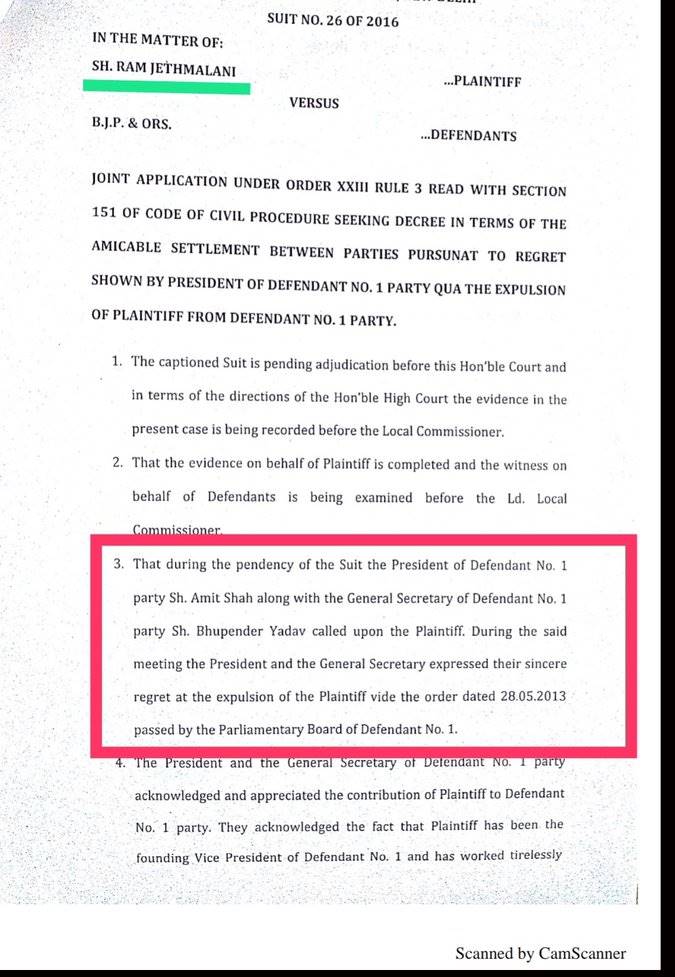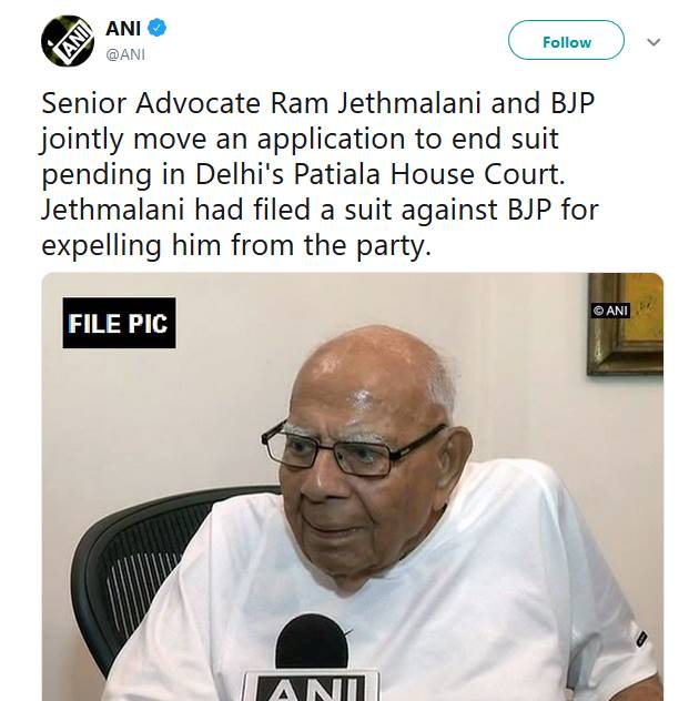 सीनियर वकील और पूर्व केंद्रीय मंत्री राम जेठमलानी और भाजपा ने संयुक्त रूप से दिल्ली के पटियाला हाउस कोर्ट में लंबित मुकदमे को खत्म करने के लिए अर्जी दाखिल किया है। जेठमलानी ने यह मुकदमा भाजपा से निष्कासित करने के खिलाफ दायर किया था। बीजेपी अध्यक्ष अमित शाह और पार्टी के राष्ट्रीय महासचिव भूपेंद्र यादव ने राम जेठमलानी के बीजेपी से निष्कासन पर अफसोस जताया है। साल 2013 भारतीय जनता पार्टी ने वरिष्ठ अधिवक्ता और राज्यसभा सदस्य राम जेठमलानी को अनुशासनहीनता के लिए पार्टी की प्राथमिक सदस्यता से छह साल के लिए निष्कासित कर दिया था। जेठमलानी को लिखे एक पत्र में भाजपा महासचिव अनंत कुमार ने कहा था कि पार्टी के संसदीय बोर्ड ने जेठमलानी को प्राथमिक सदस्यता से निष्कासित करने के लिए सर्वसम्मति से निर्णय लिया गया। अनंत कुमार ने यहां तक कहा था कि पार्टी व्हिप का उल्लंघन करने के लिए जेठमलानी के खिलाफ अतिरिक्त कार्रवाई भी की जाएगी।