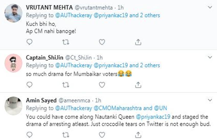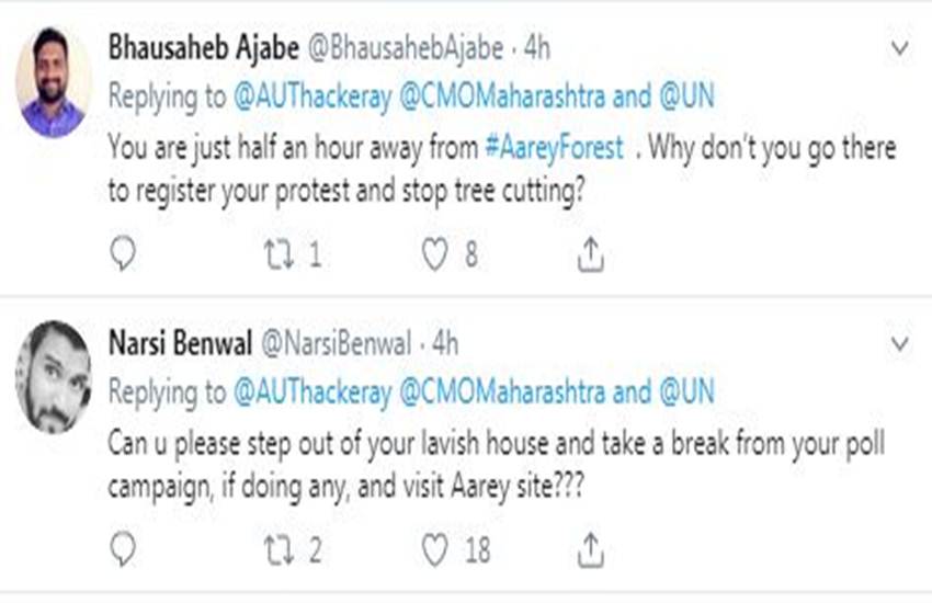 वहीं आदित्य के ट्वीट्स पर ट्विटर यूजर्स ने भी अलग-अलग प्रतिक्रियाएं दी हैं। एक यूजर ने तो उन्हें ड्रामेबाज तक करार दे दिया। एक यूजर ने कहा ‘आप आरे कॉलोनी से सिर्फ आधे घंटे की दूरी पर रहते हैं, अगर आपको विरोध जताना था तो आप वहां क्यों नहीं आए?’ एक अन्य यूजर कहते हैं ‘आप अपने चुनावी प्रचार से थोड़ा समय निकालकर आरे कॉलोनी नहीं आ सकते क्या?’