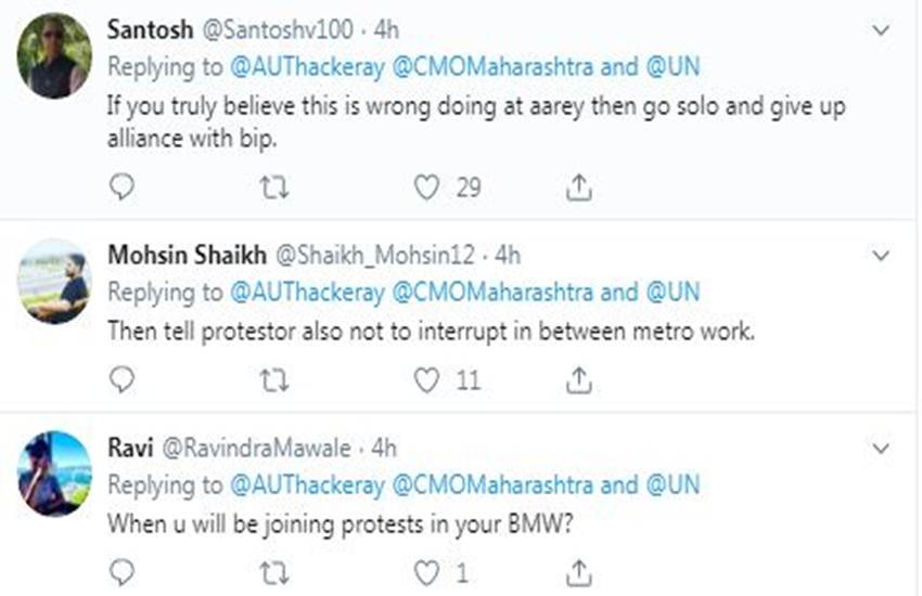 एक अन्य यूजर ने कहा ‘ज्यादा समझदारी बहुत घातक होती है मिस्टर ठाकरे। जब ये परियोजना बनी थी तो उसमें सहमति आपकी भी थी और आप उस सरकार में साझेदार थे। अब चुनाव आया तो प्रकृति प्रेमी बन रहे हो उस समय ही विरोध क्यों नहीं किया।’ एक यूजर कहते हैं ‘मुंबईवासियों के वोट्स पाने के लिए किस हद तक ड्रामेबाजी की जा रही है।’