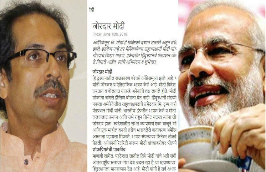 लेख में मोदी द्वारा अमेरिकी कांग्रेस में दिया गए भाषण को ऐतिहासिक बताया गया है। सामना में लिखा है, ‘हिंदुस्तान के लोग किस तरह हास्यास्पद उच्चारण करते हैं, इसकी नकल अमेरिका के राष्ट्राध्यक्ष पद के उम्मीदवार डोनाल्ड ट्रंप कर रहे थे लेकिन उन्हीं की संसद में भारत के पीएम मोदी ने ‘भारतीय’ अंग्रेजी में भाषण दिया और मोदी के भाषण को हर वाक्य के बाद तालियों की गड़गड़ाहट मिल रही थी। खड़े होकर सीनेट सदस्य उनकी प्रशंसा कर रहे थे। यह जबरदस्त था।’