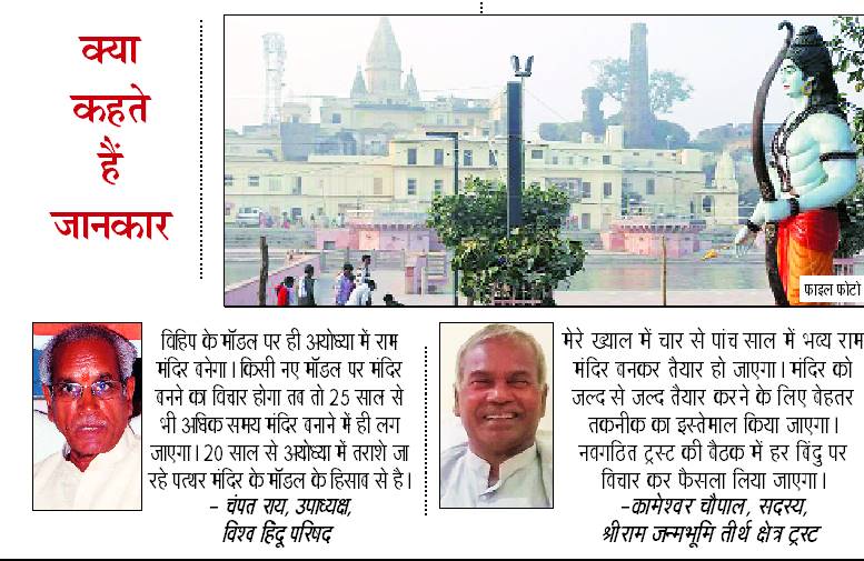 राममंदिर ट्रस्ट में फिलहाल जिन सदस्यों को जगह दी गई है, उनमें विहिप का एक भी सदस्य नहीं है। सवाल उठाया जाने लगा है कि अयोध्या में विहिप की कार्यशाला में राममंदिर के लिए तराशे गए पत्थरों का भविष्य क्या होगा। तराशे गए पत्थरों की उपयोगिता क्या हो सकती है। यह तय है कि राममंदिर के लिए तराशे गए पत्थरों की उपयोगिता अब नवगठित ट्रस्ट को ही तय करनी है। विहिप को अब भी उम्मीद है कि राममंदिर उनके प्रस्तावित मॉडल एवं तराशे गए पत्थरों से ही बनेगा। अटकलें लगाई जा रही हैं कि नवगठित ट्रस्ट इन पत्थरों को दान में लेकर मंदिर निर्माण में उपयोग कर सकता है। राममंदिर के लिए अब तक एक लाख दस हजार घनफुट पत्थरों को तराशा जा चुका है। दूसरी ओर, सरकार और रामजन्मभूमि न्यास के बीच इस बात पर लगभग सहमति बन गई है कि तराश कर रखे गए जयपुर के लाल पत्थरों और खंभों से ही रामजन्मभूमि पर मंदिर का निर्माण शुरू किया जाएगा। इस संबंध में रामजन्मभूमि न्यास अध्यक्ष महंत नृत्यगोपाल दास व उनके उत्तराधिकारी महंत कमल नयन दास की केंद्रीय गृहमंत्री अमित शाह से दो दौर की वार्ता हो चुकी है। इस वार्ता के आधार पर एक प्रस्ताव ट्रस्ट की पहली बैठक में रखा जाएगा।