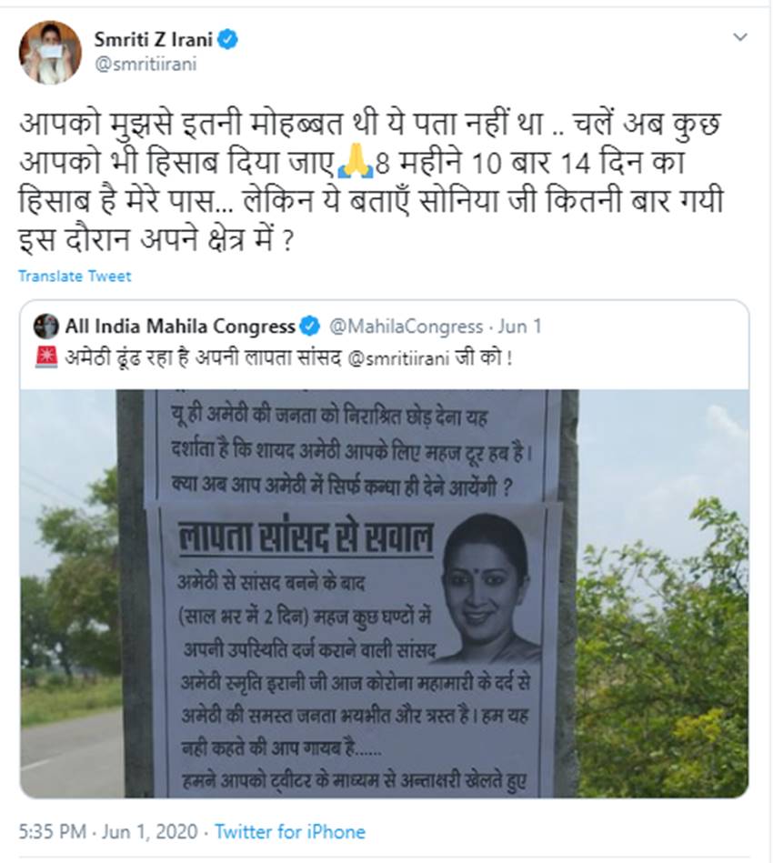 बीजेपी संसाद स्मृति ईरानी के गुमशुदगी के पोस्ट उनके ही संसदीय क्षेत्र अमेठी में नजर आए। इस मामले पर ईरानी ने पलटवार करते हुए कांग्रेस पर निशाना साधा है। उन्होंने ट्वीट करते हुए कहा कि कांग्रेसियों ने लॉकडाउन का उल्लंघन किया जिसके चलते कोरोना का संक्रमण फैल गया। इसके अलावा उन्होंने सोनिया गांधी पर निशाना साधते हुए लिखा है, सोनिया गांधी कितनी बार रायबरेली गईं?
