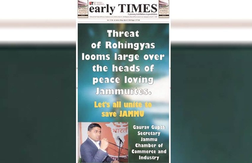 जम्मू में बांग्लादेश से आकर रह रहे रोहिंग्या मुसलमानों को निकालने की कवायद तेज होती दिख रही है। वहां कुछ समूहों द्वारा लोकल न्यूज़ पेपर में विज्ञापन देकर रोहिंग्या मुसलमानों के खिलाफ जनता में संदेश पहुंचाया जा रहा है। मुख्य रूप से चैम्बर ऑफ कॉमर्स एंड इंडस्ट्री और नेशनल पैंथर्स पार्टी जैसे संगठनों द्वारा विज्ञापन दिया जा रहा है। इन विज्ञापनों में रोहिंग्या मुसलमानों को ‘टाइम बम’ बताकर जम्मू के लिए खतरा बताया जा रहा है। एक विज्ञापन में लिखा है, ‘रोहिंग्या: टिक-टिक करते टाइम बम हैं। जम्मू को बचाने के लिए इन्हें बाहर निकाला जाए। इनके कारण शांति पसंद करने वाले जम्मू वासियों को काफी परेशानी हो रही है। जम्मू को बचाने के लिए एक होना जरूरी है।’ आपको बता दें कि पैंथर्स पार्टी ने रोहिंग्या मुसलमानों के निष्कासन के लिए प्रदर्शन भी किया था।